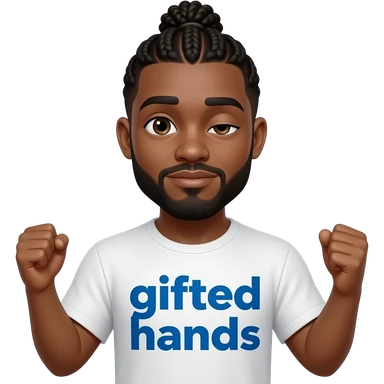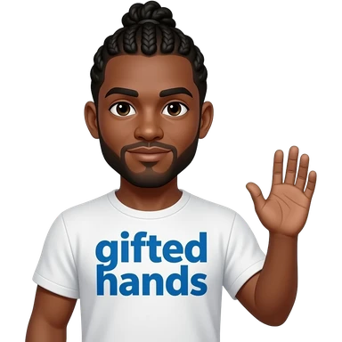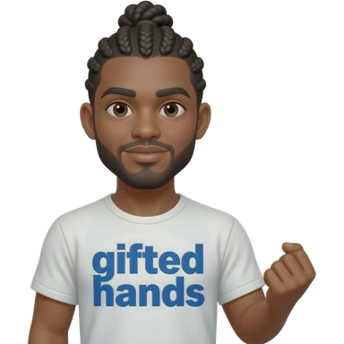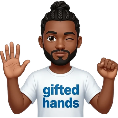 African American man with missing left arm and right arm missing a hand with cornrow braids into a man bun with a lazy eye wearing a white shit that says gifted hands in bold blue letters emoji