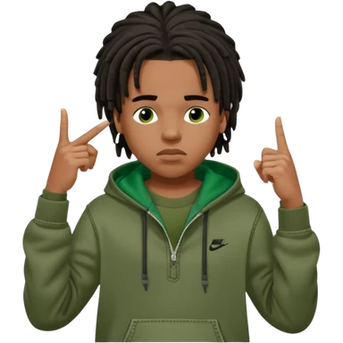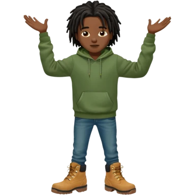African American boy with short black dreadlocks wearing a green Nike hoodie wearing denim skinny jeans and timberland boots with his hands out emoji