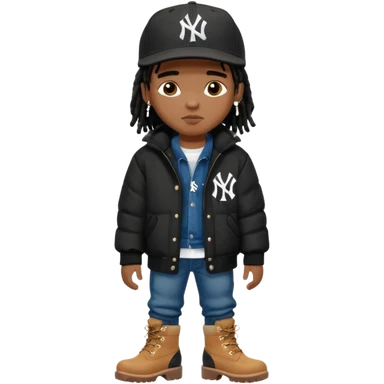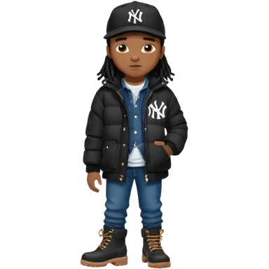 African American boy with short black dreadlocks wearing a black New York Yankees logo baseball cap wearing a black bubble winter coat wearing denim skinny jeans and timberland boots emoji