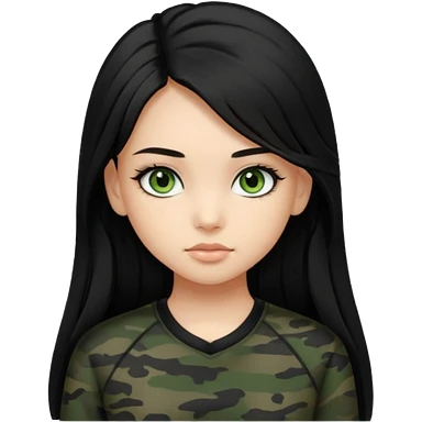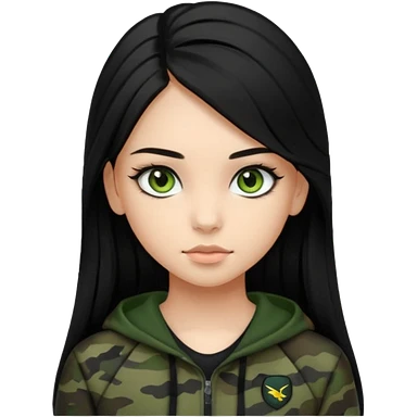 cute teenage girl, cute black trendy athletic clothes, light tan skin, very dark camo green eyes, long black hair, very long eyelashes emoji