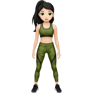cute teenage girl, cute athletic clothes, light tan skin, dark camo green eyes, long black hair, very long eyelashes emoji