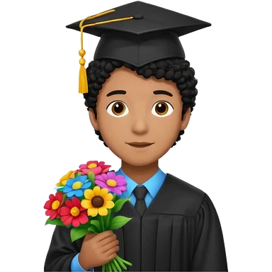 Graduated Students, Male, brown skin, black curly hair, wearing graduation cap, holding bouquet of flowers emoji