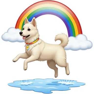 White belgian Shepard jumping over Rain puddles. There is a rainbow in the sky emoji