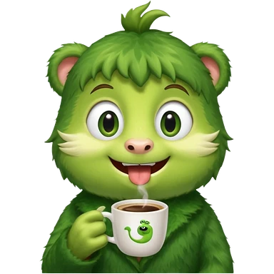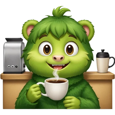 Cut the Rope's Om Nome in barista's suite with a cup of cofee emoji