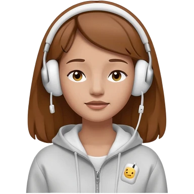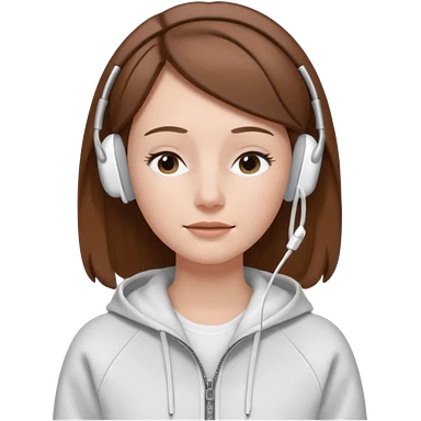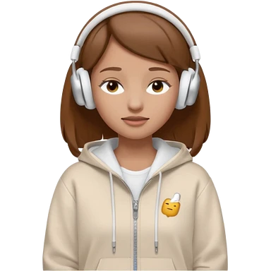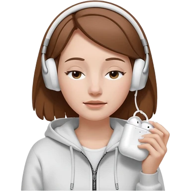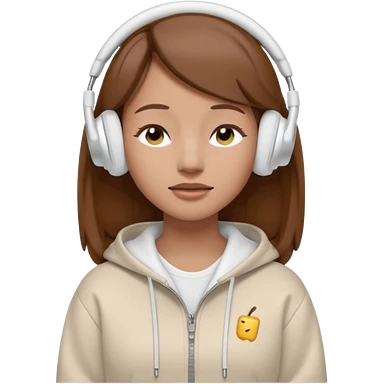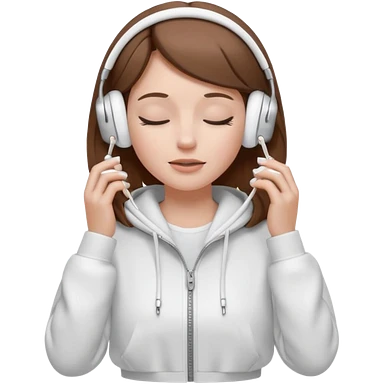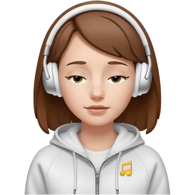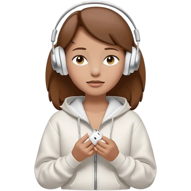 A clean, minimal emoji-style illustration of a light-skinned girl with brown hair worn loose. Her eyes are closed while listening to music with silver AirPods Max. She’s wearing a white zip-up hoodie. Smooth 3D emoji style, soft lighting, neutral tones. emoji