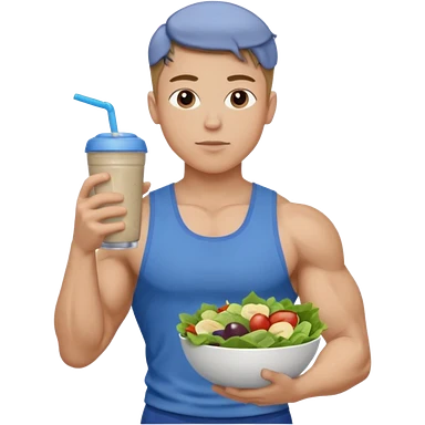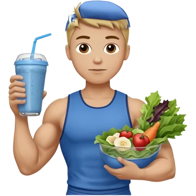 A young male person with a muscular, well-defined build. He has short dark blonde hair, a light skin tone, and a neutral facial expression. He wears blue cloth. He is holding a salad in one hand and a protein shake in the other. emoji