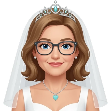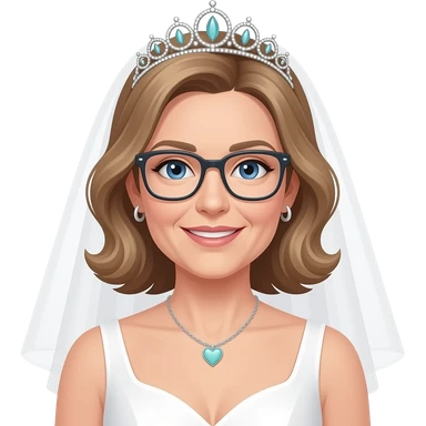 AJM - tiara, wedding dress, woman, blue eyes, mid 40's age, silver small hoop earrings, light brown hair, rectangular glasses, shoulder length wavy hair, small tiffany heart necklace emoji