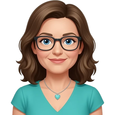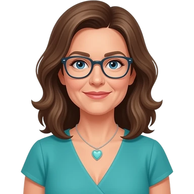 AJM - woman, mid 40's age, mid brown hair, rectangular glasses, shoulder length wavy hair, tiffany heart necklace, blue eyes, teal dress, emoji