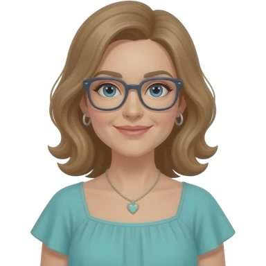 AJM - woman, narrow face, blue eyes, mid 40's age, silver small hoop earrings, light brown hair, rectangular glasses, shoulder length wavy hair, small tiffany heart necklace, teal summer dress emoji
