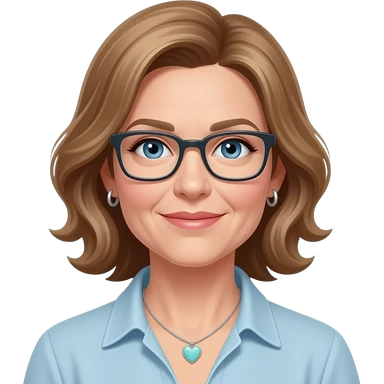 AJM - woman, blue eyes, mid 40's age, silver small hoop earrings, light brown hair, rectangular glasses, shoulder length wavy hair, small tiffany heart necklace emoji