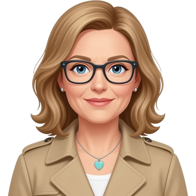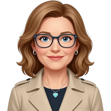 AJM - woman, blue eyes, mid 40's age, earrings, light brown hair, rectangular glasses, shoulder length wavy hair, small tiffany heart necklace, ted baker coat emoji
