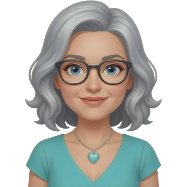 AJM - woman, glasses, greying hair shoulder length wavy hair, tiffany heart necklace, blue eyes, teal dress, emoji