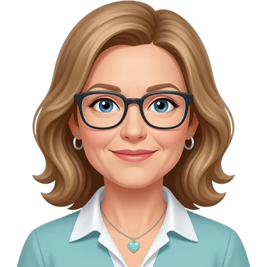 AJM - woman, blue eyes, mid 40's age, mid brown hair, rectangular glasses, shoulder length wavy hair, small tiffany heart necklace, dark teal dress, emoji
