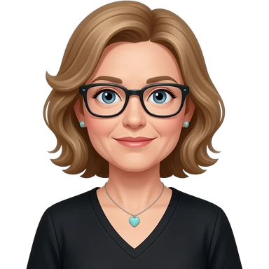 AJM - woman, blue eyes, mid 40's age, earrings, light brown hair, rectangular glasses, shoulder length wavy hair, small tiffany heart necklace, black v neck emoji