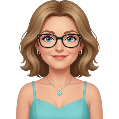 AJM - woman, blue eyes, mid 40's age, silver small hoop earrings, light brown hair, rectangular glasses, shoulder length wavy hair, small tiffany heart necklace, teal summer dress emoji