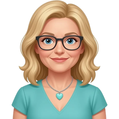 AJM - woman, mid 40's age, dark blonde hair, rectangular glasses, shoulder length wavy hair, tiffany heart necklace, blue eyes, teal dress, emoji