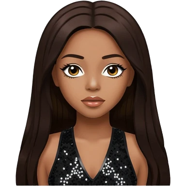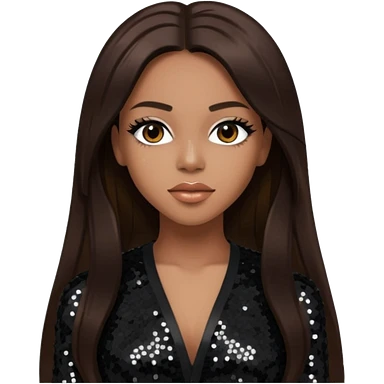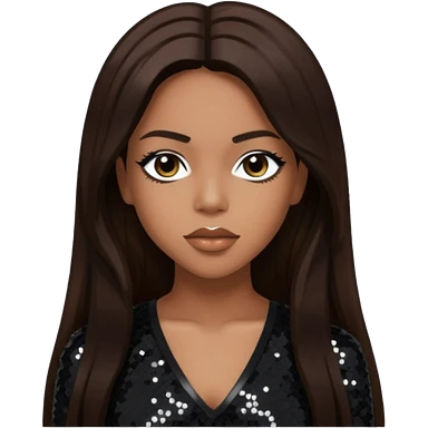 Aaliyah with long dark brown hair, black sequin outfit emoji