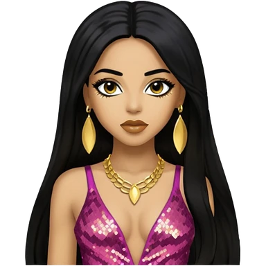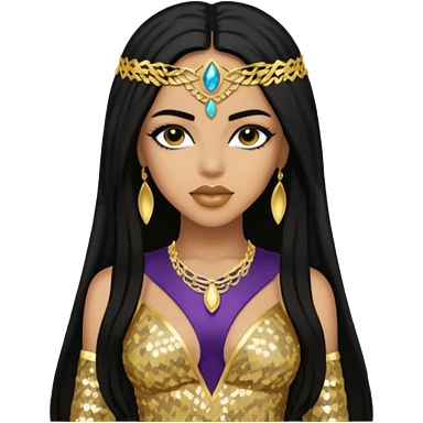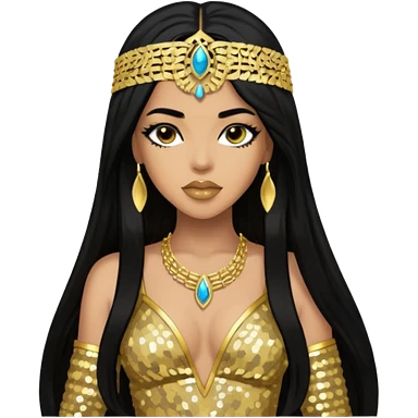Aaliyah as Akasha with long black hair, gold sequin outfit emoji