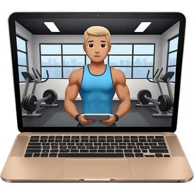 Open laptop on a dark background, showing a male fitness trainer inside a modern professional gym on the screen— smooth rounded edges, soft lighting, no text or logos, minimalistic and high-quality rendering. Only the laptop is visible, centered emoji