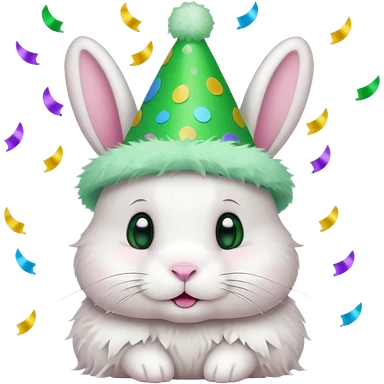 Rabbit in Green Party Hat – white bunny with cone party hat and confetti. emoji