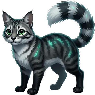 Realistic tiger-striped edgy bluish greyish blackish whitish silvery coppery Shiny Colorful Dusky Dark Gloomy Glossy Genet-Caracal-Lion-Bobcat-fusion-animal-hybrid-creature, full body, tufted ears, long thin tufted tail emoji