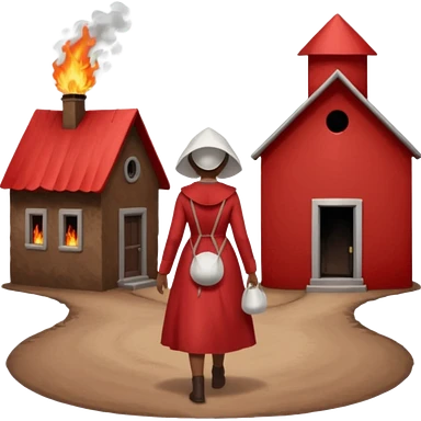 handmaids tale style woman burning house down walking away from house. shes wearing the nun hands maid tale hat cant see her face with brown hair shes wearing the red handmaids tale costume with white bonnet emoji
