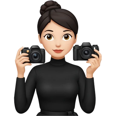 48 year old woman photographer with dark hair in a bun, wearing black clothes emoji