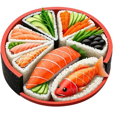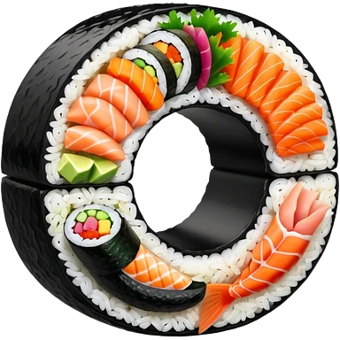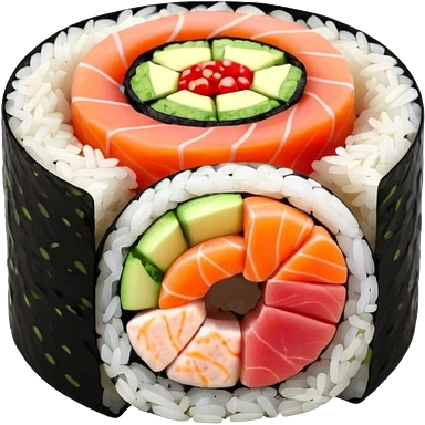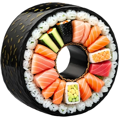 single round sushi maki cross-section, rice ring and colorful center emoji
