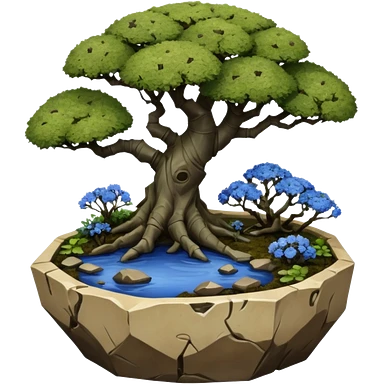 Alien landscape mudman very old broken cracked intricate Stone Age rocky-crusted irregular dodecagon-shaped shallow dark moss rough bark blue willow flowered maple tree bonsai pot emoji