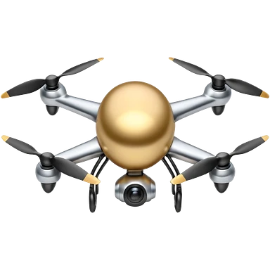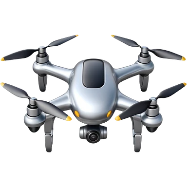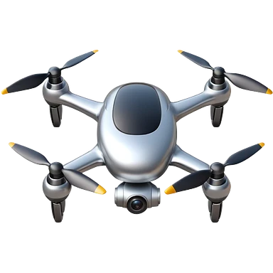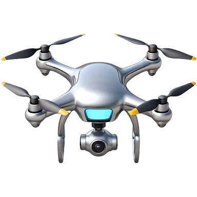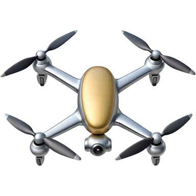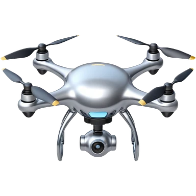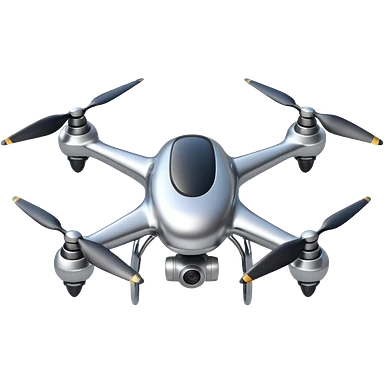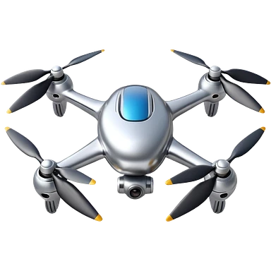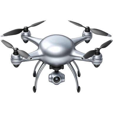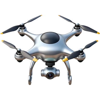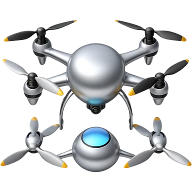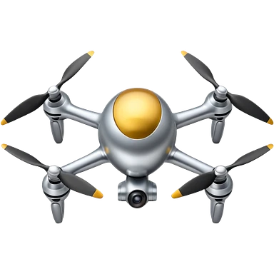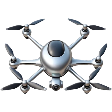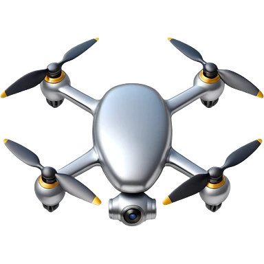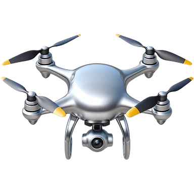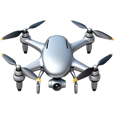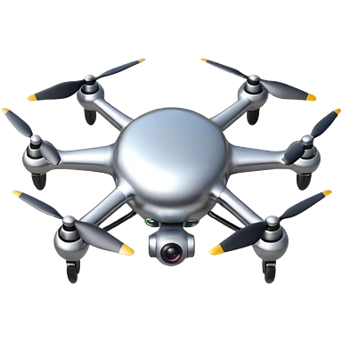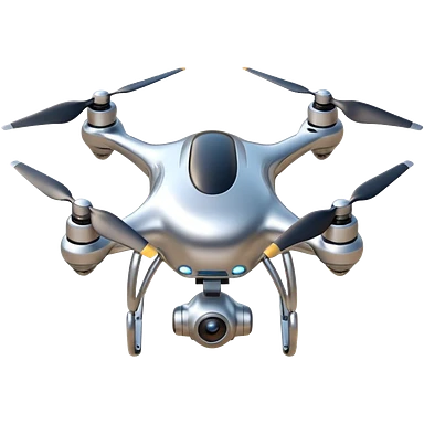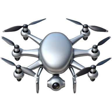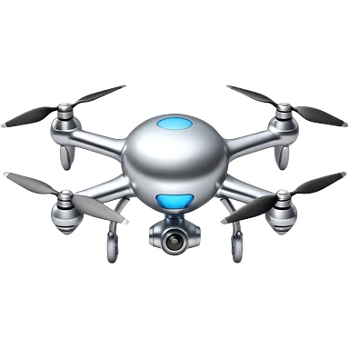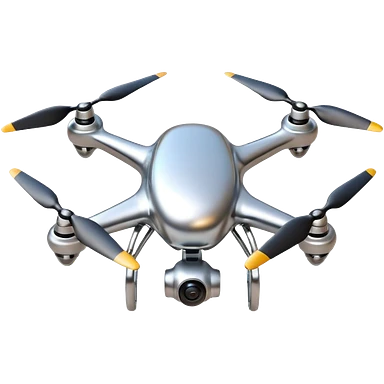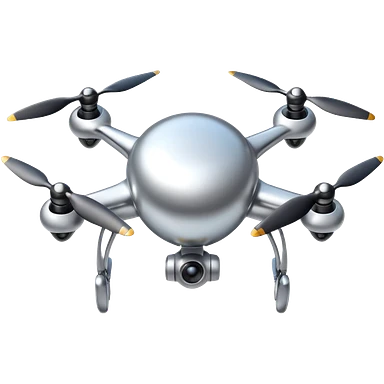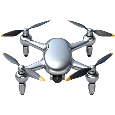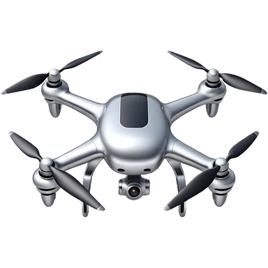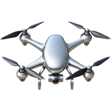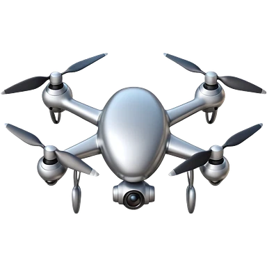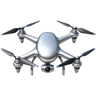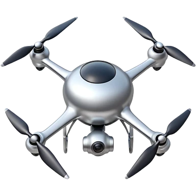A futuristic drone emoji made of polished silver chrome, smooth rounded body, minimal propellers, reflective metallic surface, soft studio lighting, iOS emoji style, centered, clean white background emoji