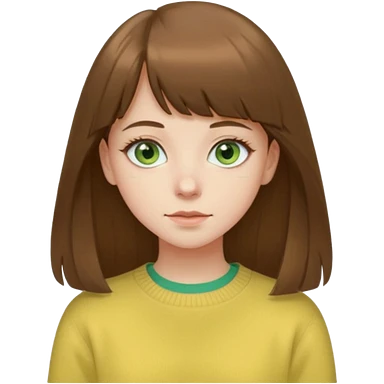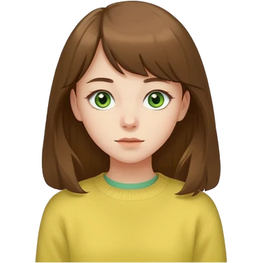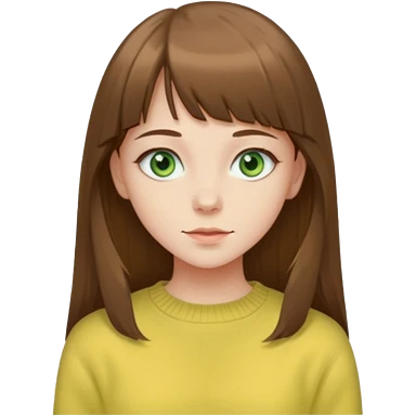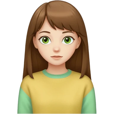 please create an emoji of a semi pale girl with long brown hair with a thin bang, green eyes, wearing a pastel yellow sweater emoji
