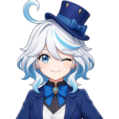 Furina de Fontaine from Genshin Impact; Beautiful gorgeous anime lady with white wavy hair with thin blue stripes, blue eyes, blue short top hat with a blue bow tie, smug smile, laughing, happy, blue coat, blue cravat, white gloves emoji