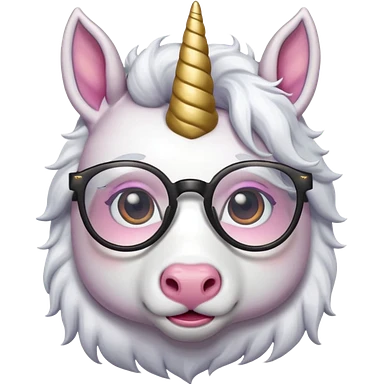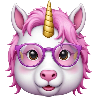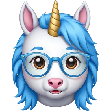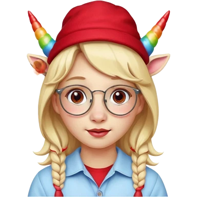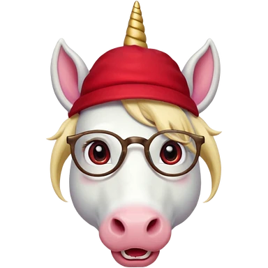 unicorn face cute wearing cute red hat, horn piercing through the hat looking in the camera, blond hair and spectacled. with big horn emoji