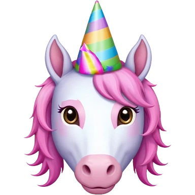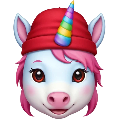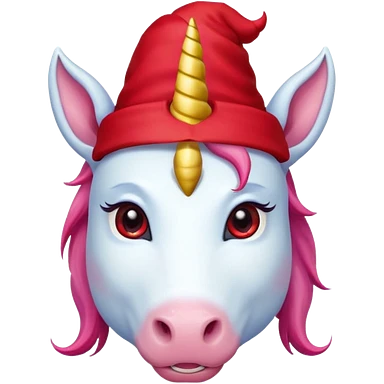 unicorn face cute wearing cute red hat, horn piercing through the hat looking in the camera emoji