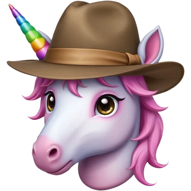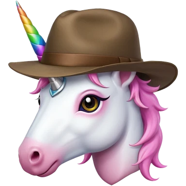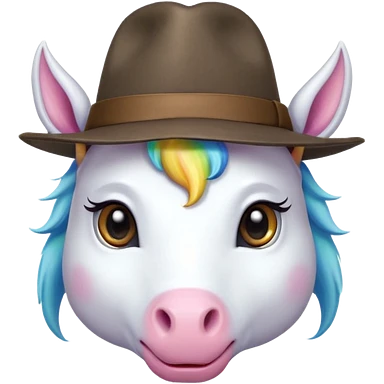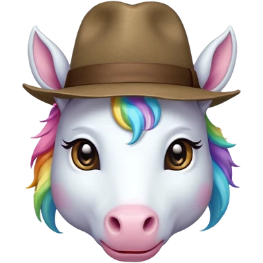 unicorn face cute wearing fedora, horn piercing through the hat looking in the camer emoji