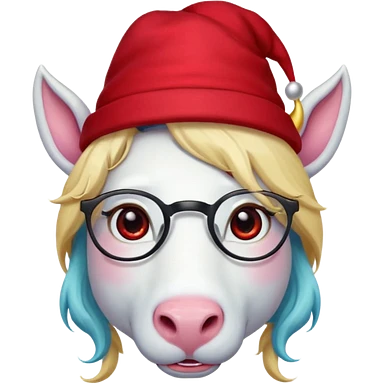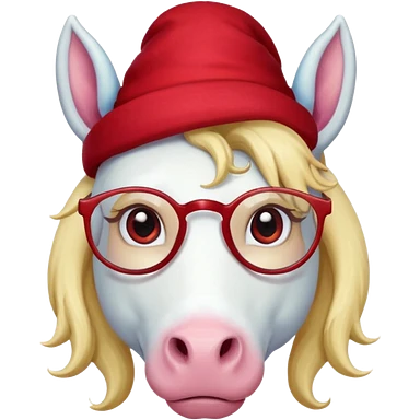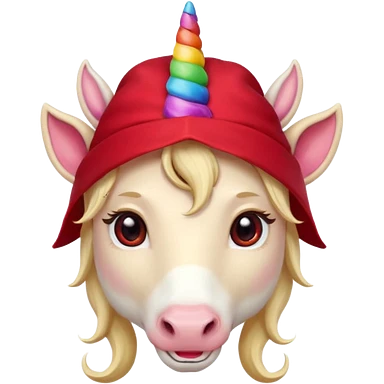 unicorn face cute wearing cute red hat, horn piercing through the hat looking in the camera, blond hair and spectacled emoji