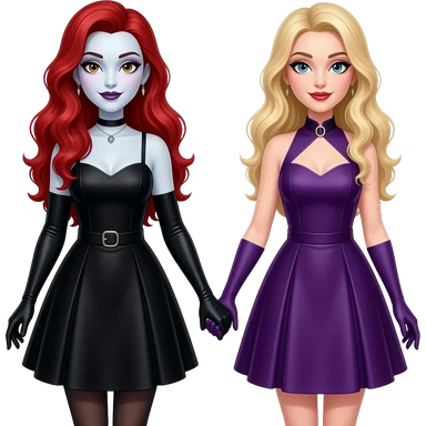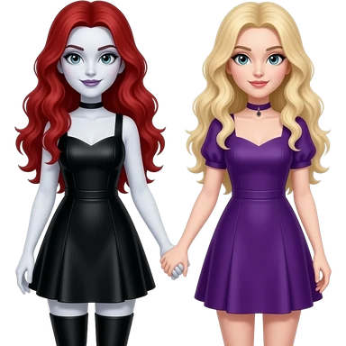 Vampiro femmina con capelli lunghi rossi ondulati con pelle bianca che indossa un vestito stretto in vita e largo sotto che arriva alle ginocchia nero e degli anfibi lunghi che sta tenendo la mano a una sua amica vampiro FEMMINA con i capelli biondi e un vestito identico al suo viola emoji