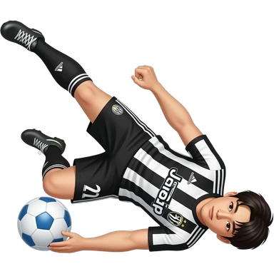 Acrobatic overhead kick pose of football player Oh Hyeon-gyu. Body perfectly 0° parallel to the ground, head slightly below. Right leg extended at a 110° angle to his torso. He wears a clean black-and-white striped kit with only the Adidas and club logo. emoji
