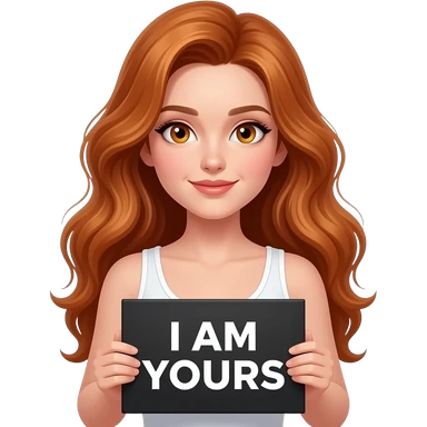 sexy girl with long wavy ginger hair and ginger eyes wearing a white tanktop is holding a black colored sign with I AM YOURS written on it emoji