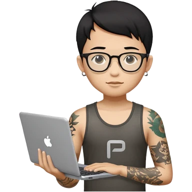 A young boy with A macbook laptop, black straight short hair, wearing glasses, wearing a tanktop, has tattoos, he is asian Add the letters "P I F" floating around emoji