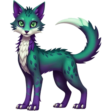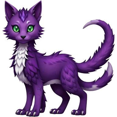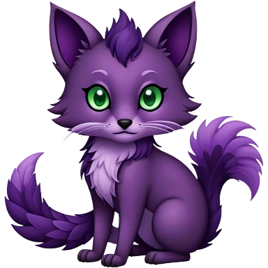 Kawaii dark edgy dark deep purplish with dark green eyes fantasy feline-vernid-sergal-fursona animal creature with a tufted tail full body with intricate markings emoji