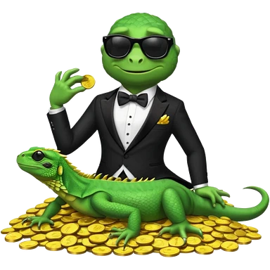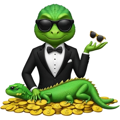 capitalist iguana banker in tuxedo and black sunglasses lying comfortly on coins emoji