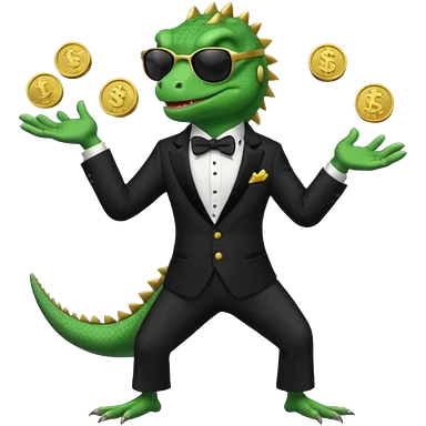capitalist iguana banker in tuxedo and black sunglasses jongling with coins emoji