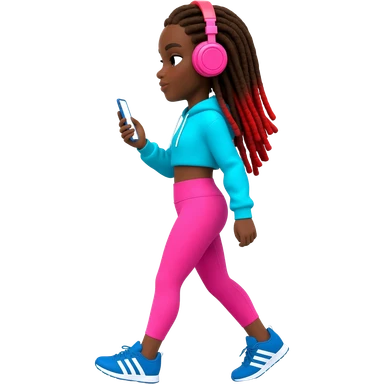 African American girl with long brown dreadlocks with red tips, pink workout leggings and a bright blue cropped hoodie, wearing big pink headphones and blue adidas pumps, taking a walk phone in hand emoji
