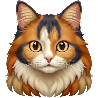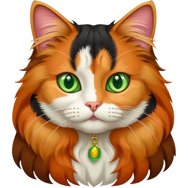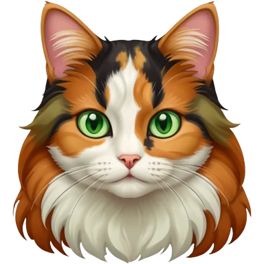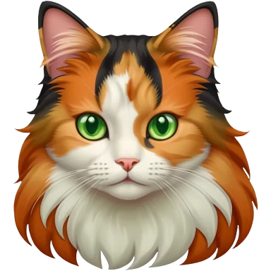 American shorthair calico cat with big green eyes and black fur on the right side of their face and orange on the left side sitting down emoji | AI Emoji Generator