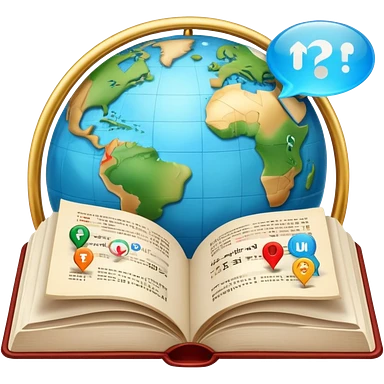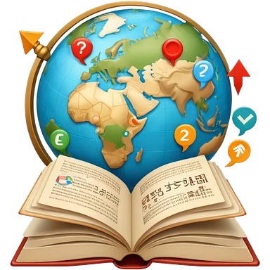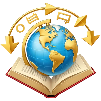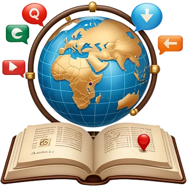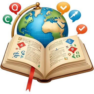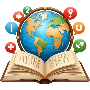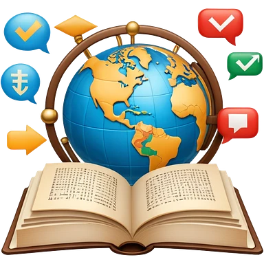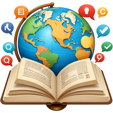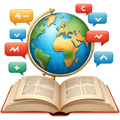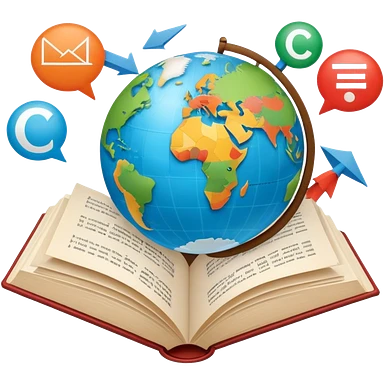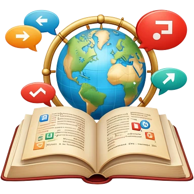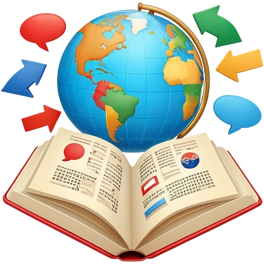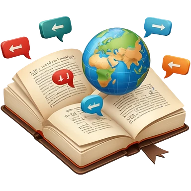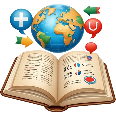 An icon featuring an open book with speech bubbles showing different alphabets—Latin, Cyrillic, Kanji. A globe and translation arrows symbolize global communication and language learning. Transparent background highlights cultural exchange and linguistic diversity. emoji