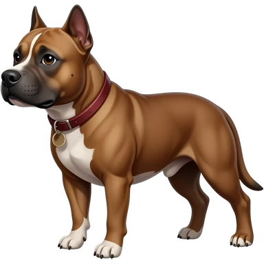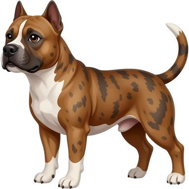 american stafforshire with ears down brown fur with dark brown straps all over his body, and a white thing on his chest and snout, but the snout one smaller emoji