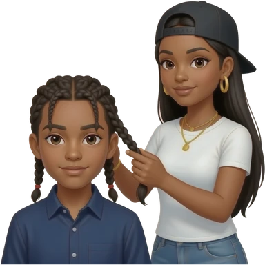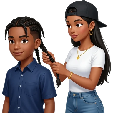 African American teenage boy with two braids in hair wearing a navy blue button up shirt getting hair braided by African American woman with long straight black hair wearing a fitted white t shirt wearing a black adjustable cap backwards on head wearing hoop earrings wearing gold tennis necklaces emoji