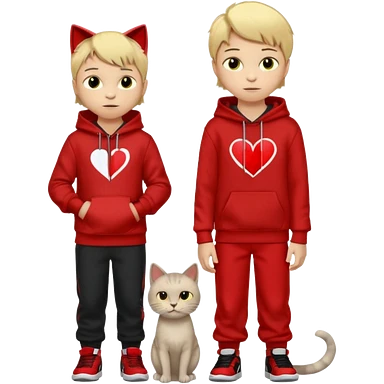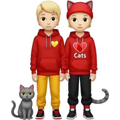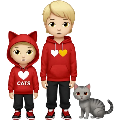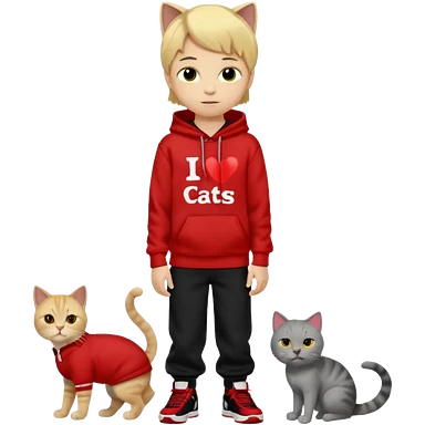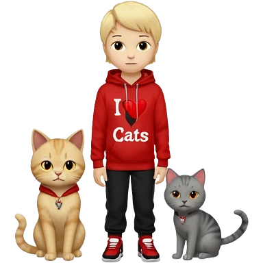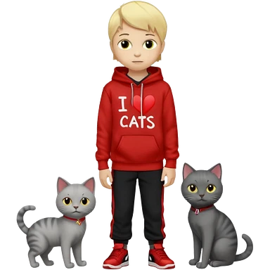 A 8 year old boy wearing a red and black hoodie say I heart cats he’s blond he has red Jordan’s and Hess wearing black pants he’s next to a gray cat with yellow eyes emoji