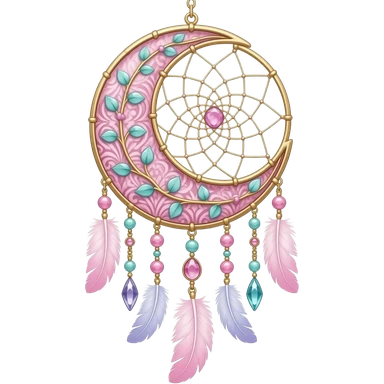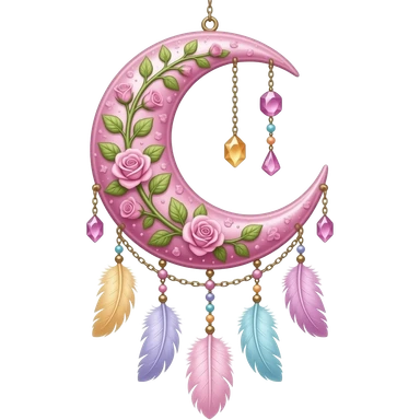 Rosy shiny glossy sparkly romantic pastel crescent damask moon with rose quartz pastel vines pastel gems pastel beads with feathers and chains suncatcher-dreamcatcher emoji